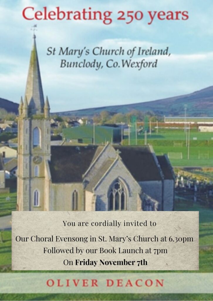 After the service, the launch will take place at 7 pm in the adjacent Sunday School. The book will be launched by local man Professor Kevin Whelan of the University of Notre Dame. The event will be chaired by the Rev. Canon Trevor Sargent, and it will also feature remarks by the author, Oliver Deacon, who comes from a family that has worshipped in this church over many generations. The evening will conclude with a reception where the congregation and guests can celebrate this lovely occasion.