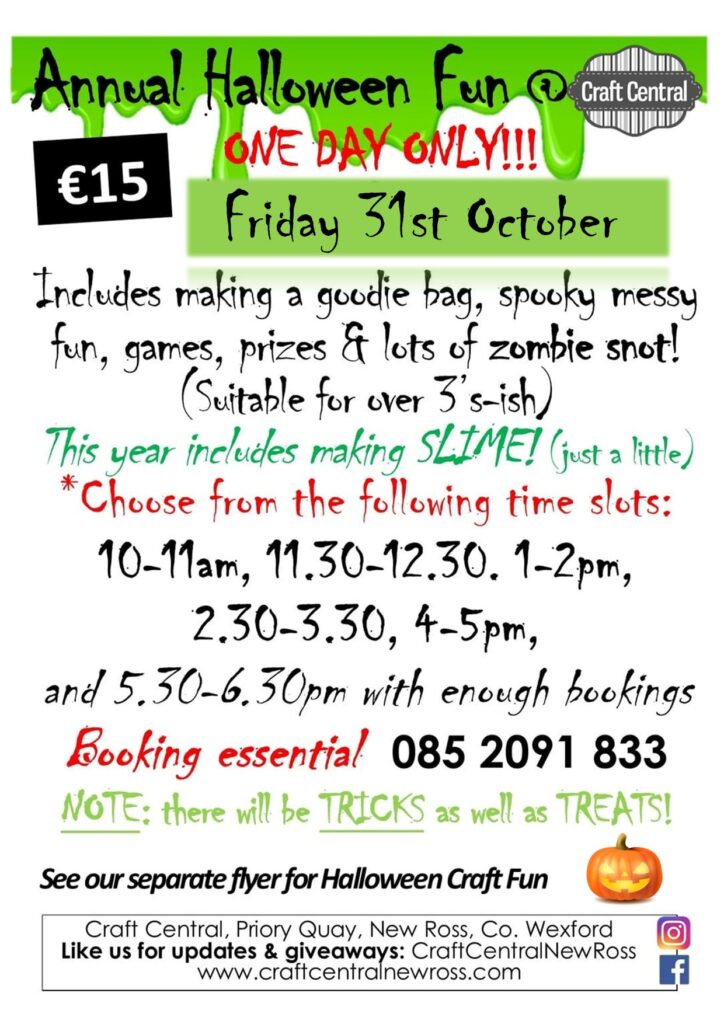 Join us at Craft Central in New Ross for our annual Halloween Fun for kids! Held on 31st October each year, children will make a treat bag to hold all the sweets they win in the games, make glow in the dark slime to bring home, visit out Spooky “Bat Cave” and enjoy the hands-IN experience of “Zombie Snot”!