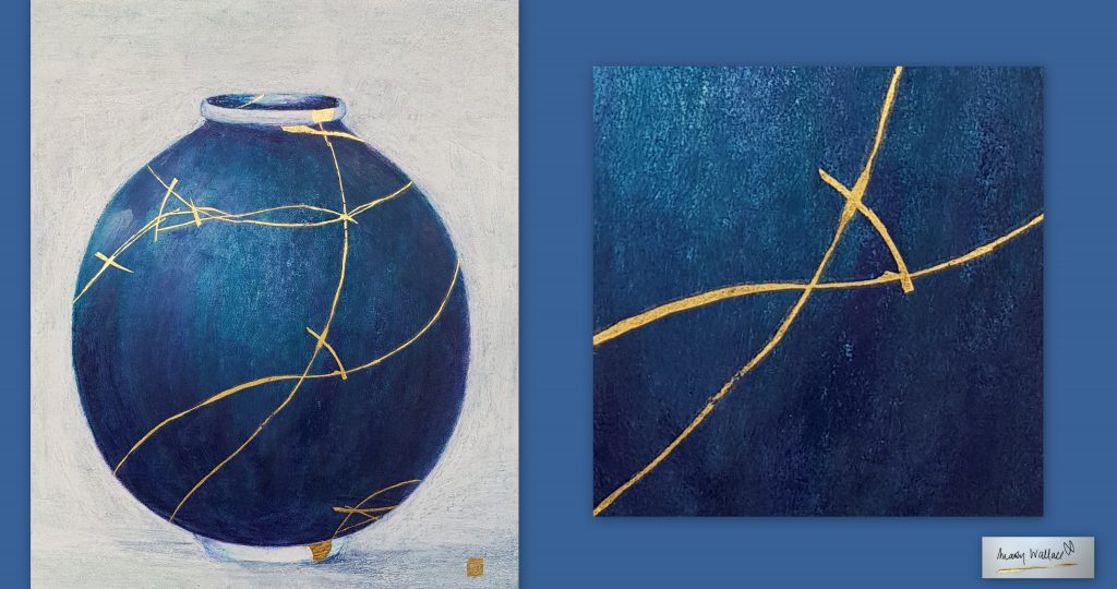 Japanese influences – kintsugi: repair using gold to summon beauty, resilience from something broken, embracing imperfection – in her art become a metaphor for healing and rebirth.