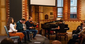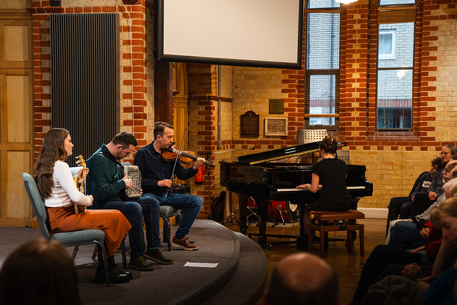 Lane To The Glen: The original album lineup is a classic combination of fiddle, button accordion and piano from Sligo’s Oisín Mac Diarmada (fiddle), Daithí Gormley (accordion) and Samantha Harvey (piano). This exciting concert features the addition of Elaine Reilly (banjo). As a group of 4, they debuted at the Padraig O’ Keefe weekend in 2024 and have recently brought their music to audiences at festivals in the United States and the United Kingdom.